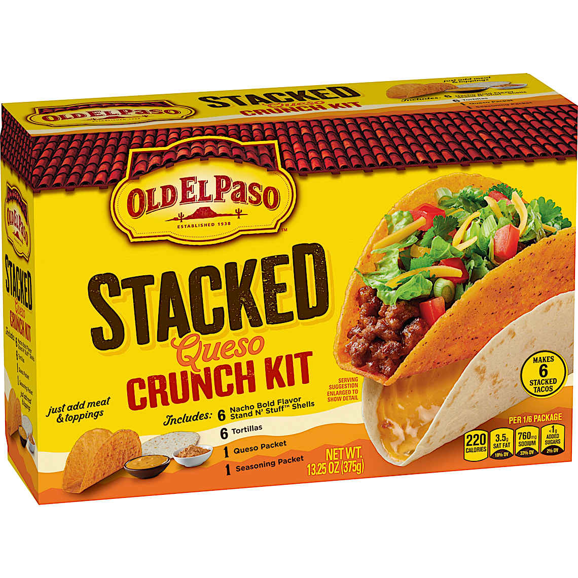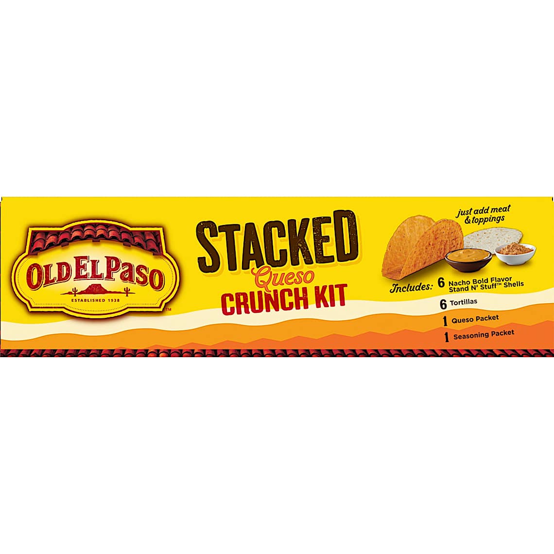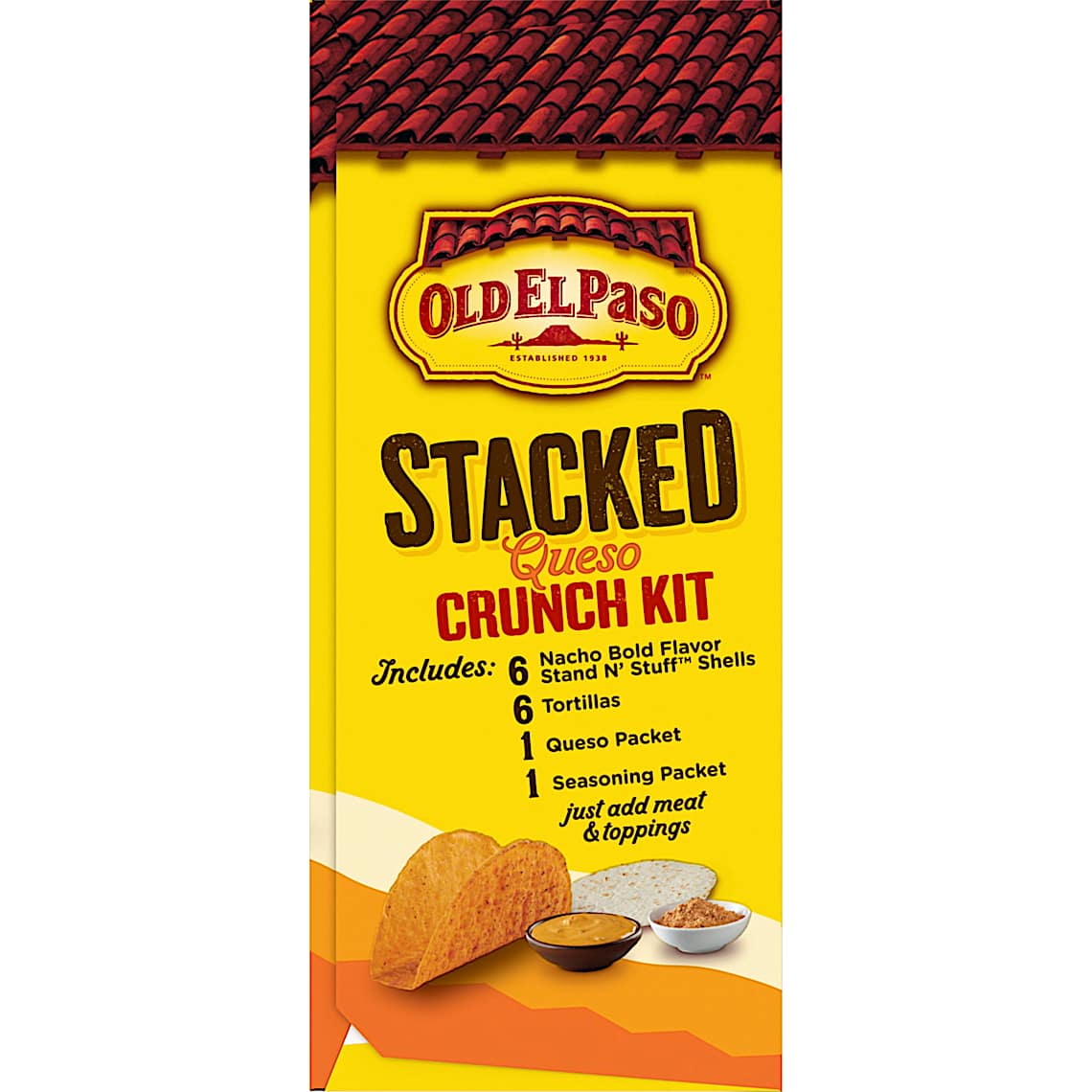Old El Paso is bringing together the classic crunch of bold nacho taco shells and the zesty taste of queso sauce with the fan-favorite soft flour tortilla into one amazing stacked experience. Old El Paso Stacked Queso Crunch Kit tacos are soft on the outside and crunchy on the inside, with a layer of delicious queso in the middle. This kit comes with 6 crunchy, cheesy Nacho Bold Flavor Stand 'n Stuff Shells, 6 tortillas, 1 queso packet, and seasoning mix - just add meat and your favorite toppings. Follow the 5 easy steps on the box to cook ground beef, mix in the seasoning, heat the shells, and build your stacked bold tacos with the cheese sauce. Add fillings and toppings like beans, sour cream, guacamole, and more for a cheesy, stacked taco creation your whole family will love. For more than 80 years, Old El Paso has been bringing families and communities together to celebrate old and new traditions around delicious, Mexican inspired flavors. We believe that any night can be a taco night, and we're here to help make it a little easier and a lot more delicious. Our variety of crispy hard taco shells, tasty soft tortillas, flavorful seasonings, and much more help make taco night fun. Contains Shelf-Stable Old El Paso Stacked Queso Crunch Taco Kit, 6 Ct, 13.25 oz.