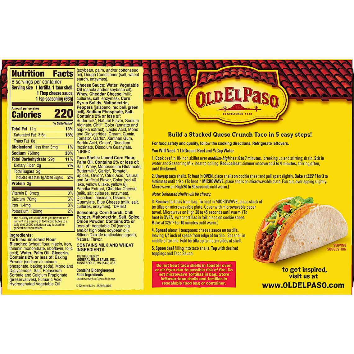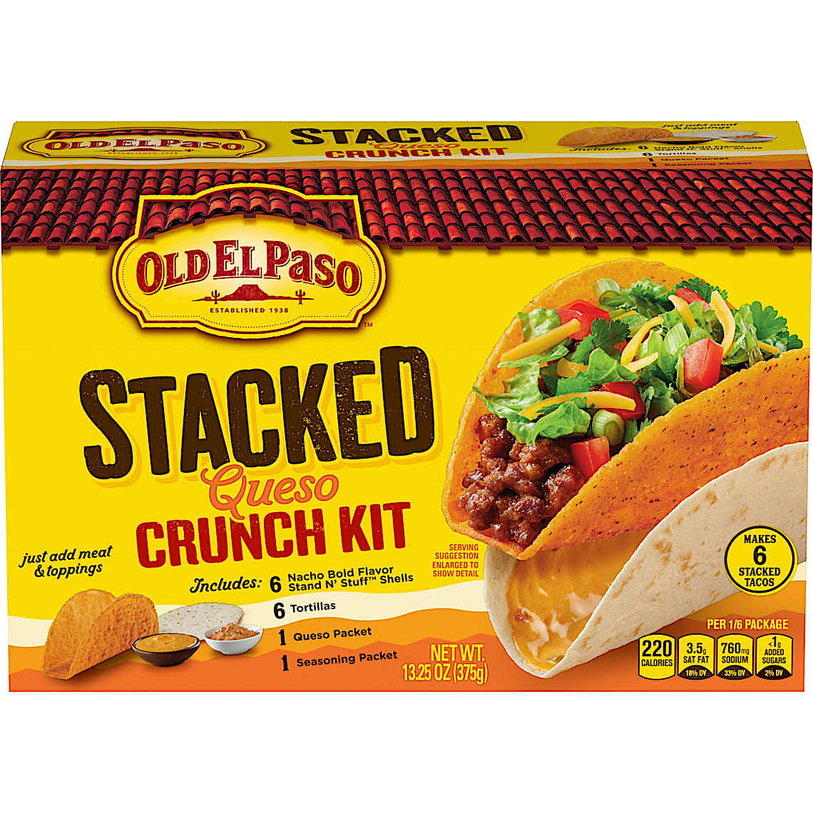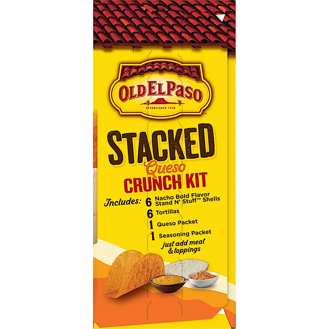 Old El Paso is bringing together the classic crunch of bold nacho taco shells and the zesty taste of queso sauce with the fan-favorite soft flour tortilla into one amazing stacked experience. Old El Paso Stacked Queso Crunch Kit tacos are soft on the outside and crunchy on the inside, with a layer of delicious queso in the middle. This kit comes with 6 crunchy, cheesy Nacho Bold Flavor Stand 'n Stuff Shells, 6 tortillas, 1 queso packet, and seasoning mix - just add meat and your favorite toppings. Follow the 5 easy steps on the box to cook ground beef, mix in the seasoning, heat the shells, and build your stacked bold tacos with the cheese sauce. Add fillings and toppings like beans, sour cream, guacamole, and more for a cheesy, stacked taco creation your whole family will love. For more than 80 years, Old El Paso has been bringing families and communities together to celebrate old and new traditions around delicious, Mexican inspired flavors. We believe that any night can be a taco night, and we're here to help make it a little easier and a lot more delicious. Our variety of crispy hard taco shells, tasty soft tortillas, flavorful seasonings, and much more help make taco night fun. Contains Shelf-Stable Old El Paso Stacked Queso Crunch Taco Kit, 6 Ct, 13.25 oz.