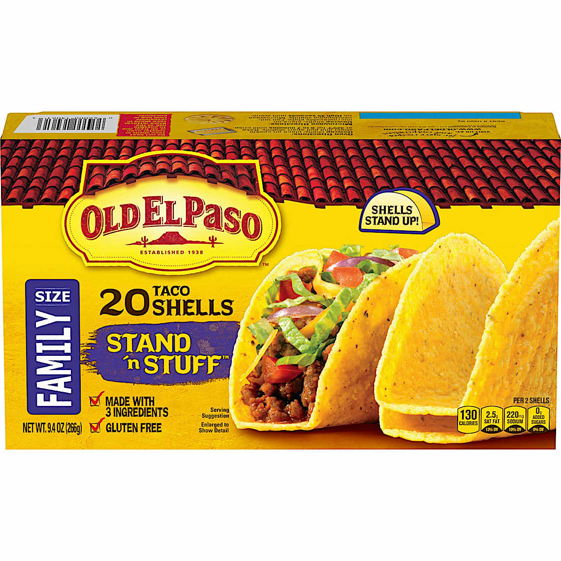 Any night can be Taco Tuesday with Old El Paso Stand 'N Stuff Taco Shells. These crunchy taco shells have a flat bottom so they stand up on their own. You simply fill them with your favorite meats, cheeses, beans, and fresh toppings for a delicious meal. Gluten free, these shells are made with just three ingredients. They're also easy to prepare - for maximum crunch, heat them up in the oven, then stuff them to enjoy an outstanding meal that gets to the table quickly. For more than 80 years, Old El Paso has been bringing families and communities together to celebrate old and new traditions around delicious, Mexican inspired flavors. We believe that any night can be a taco night, and we're here to help make it a little easier and a lot more delicious. Our variety of crispy hard taco shells, tasty soft tortillas, flavorful seasonings, and much more help make taco night fun. Contains One cardboard box of 20 whole Old El Paso Stand 'N Stuff Taco Shells, Family Size, 9.4 oz.