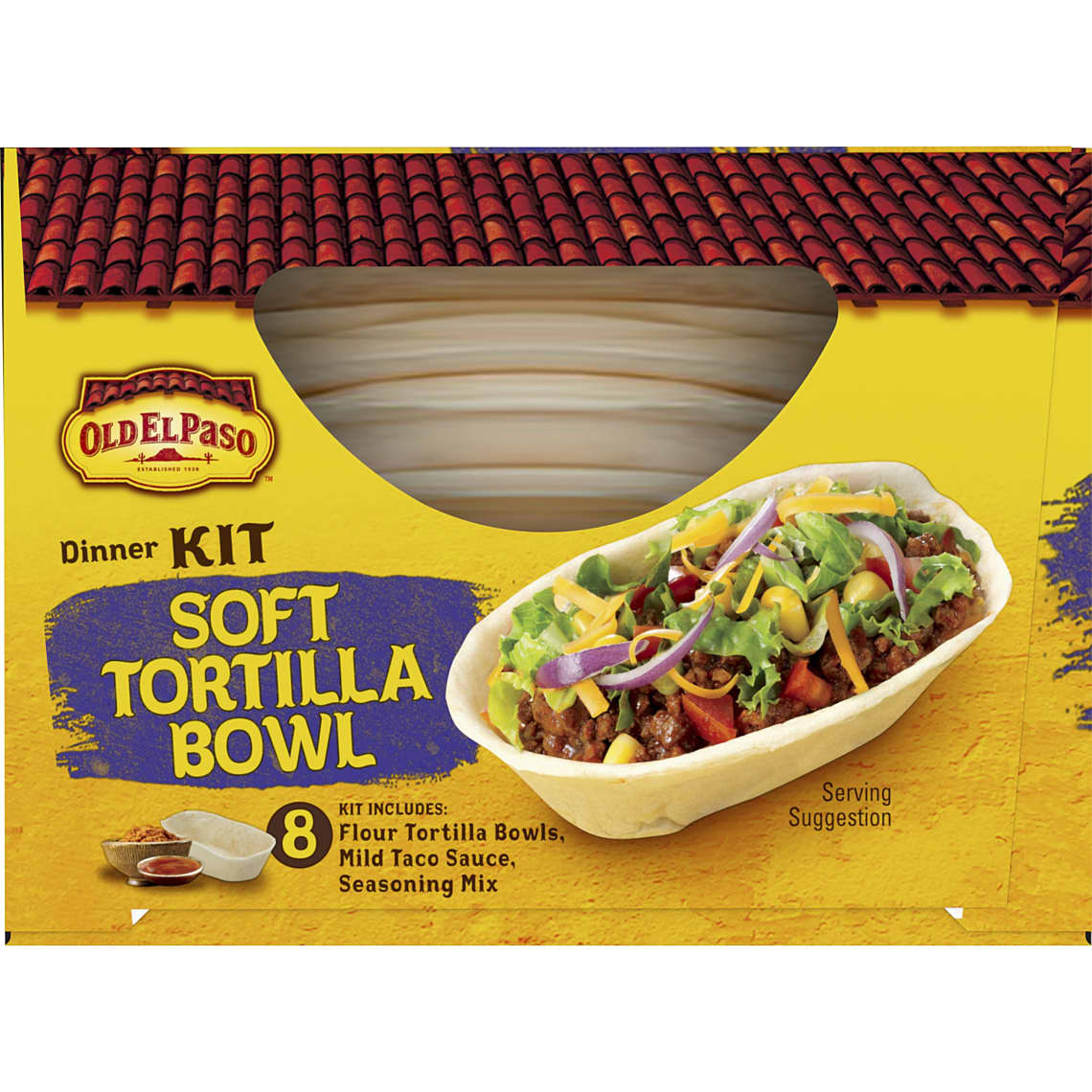 Old El Paso Soft Tortilla Bowl Dinner Kit makes it fun to spoon in your favorite taco fillings. Easy to fill, hold, and eat, you can have a quick and easy dinner option on the table in no time. Just fill the soft flour tortilla bowls with your favorite ingredients and enjoy a taco bowl that you can eat. This dinner kit comes with 8 flour tortilla bowls, mild taco sauce, and seasoning mix; you add the meat and toppings. Follow the simple instructions and you'll have a weeknight meal the whole family will love. For more than 80 years, Old El Paso has been bringing families and communities together to celebrate old and new traditions around delicious, Mexican inspired flavors. We believe that any night can be a taco night, and we're here to help make it a little easier and a lot more delicious. Our variety of crispy hard taco shells, tasty soft tortillas, flavorful seasonings, and much more help make taco night fun. Contains Shelf-Stable Old El Paso Soft Tortilla Bowl Taco Dinner Kit, Mild Taco Sauce and Seasoning Mix, 10.9 oz.