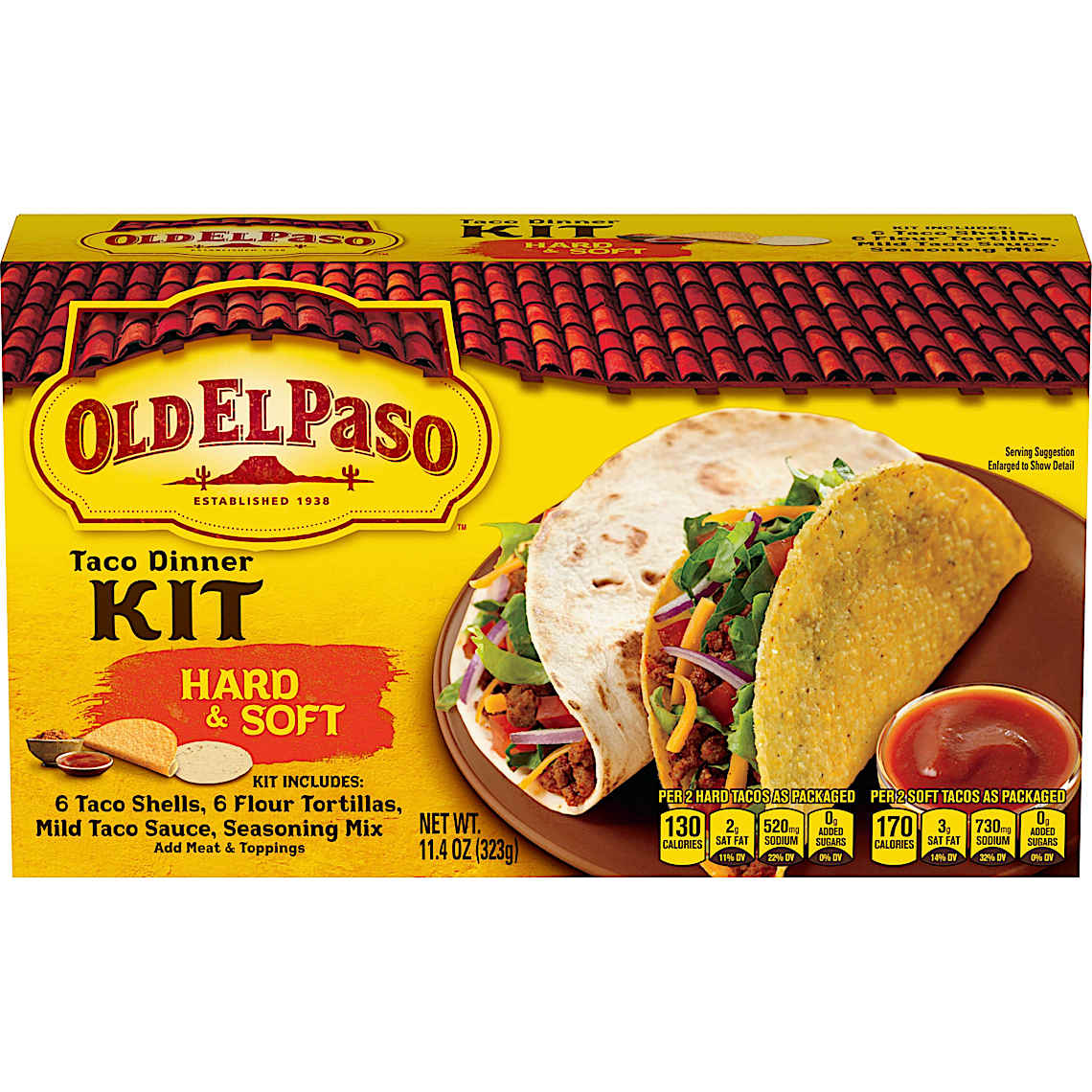 Whether you're craving soft or crunchy tacos, the Old El Paso Hard and Soft Taco Dinner Kit has you covered! This kit comes with six hard taco shells, six flour tortillas, mild taco sauce, and seasoning mix. Simply add your favorite fillings and toppings for a taco dinner that can be ready in about 20 minutes. Whip up tacos as a delicious addition to a family dinner, a party spread, or game day food table. Create a taco bar by serving alongside beans, sour cream, guacamole, and more. Whether you're looking for a quick, easy meal addition after a long day or a fun part of dinner for the family, this kit has everything you need to create the bold, delicious flavors you crave. Perfect for busy families or to feed the hungry taco fans in your household, stock up on these taco kits as an ideal pantry staple. Makes six total servings per kit. Contains one shelf-stable Old El Paso Hard and Soft Taco Dinner Kit, Mild Taco Sauce and Seasoning Mix, 12 Ct, 11.4 oz.