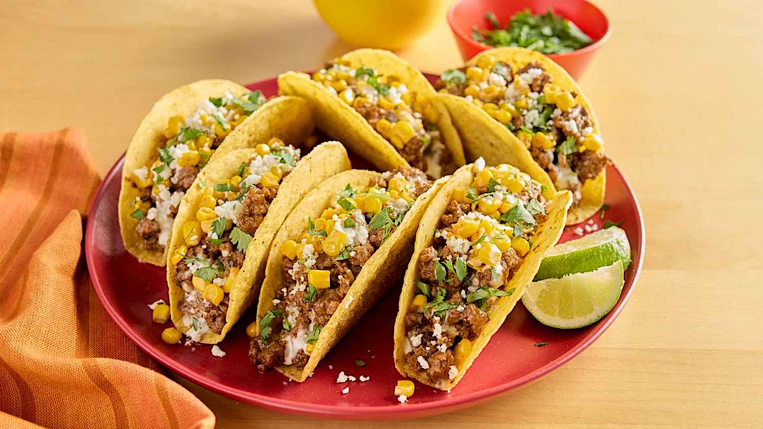 Spicy, creamy, cheesy street corn and classic crunchy beef tacos join forces in this simple dinner that comes together in just one skillet. Take advantage of fresh sweet corn when available, or use equally tasty frozen when corn is out of season. Old El Paso™ Spicy Queso Blanco Sauce stands in for the mayo used in the traditional version for a convenient, squeezable way to amp up the flavor of these fun tacos.